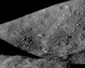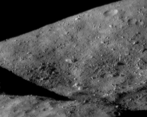NEAR Shoemaker photographed the southern part of Eros' saddle region on December 19, 2000, from an orbital altitude of 37 kilometers (23 miles). The low ridge in the foreground (bottom) casts a wedge-shaped shadow against the hill in the background. The surface here is packed with boulders, the largest of which (near the center of the picture) is about 60 meters (200 feet) across. The whole scene is about 1.5 kilometers (0.9 miles) across. |