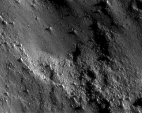 NEAR Shoemaker took this picture at 8:45 p.m. EST on January 25, 2001, during one of the spacecraft's low-altitude passes over the surface of Eros. The distance to the center of the picture is only 9 kilometers (5.6 miles), so the entire scene is a mere 340 meters (1,120 feet) across. At this scale, we can distinguish features less than 2 meters across. The asteroid's surface appears nearly devoid of obvious craters and is instead dominated by small boulders. In the upper left part of the image, a smooth deposit with a lower density of boulders is in contrast to the very rough-textured material seen at the lower right. |