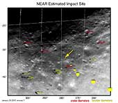 This map projection of NEAR Shoemaker images shows locations and sizes of landmarks surrounding the spacecraft's planned landing site. Diameters of craters are shown in red, and diameters of boulders are shown in yellow. Diameters are given in units of meters (1 meter is about 3.3 feet). Coordinates along the left side of the map are degrees south latitude and coordinates along the bottom are degrees west longitude. The six yellow "footprint" boxes represent approximate image size at 500,1,000, 1,500, 2,000, 2,500 and 3,000 meters above the surface during descent. The spacecraft will take pictures continuously between each spot. The arrow marks the estimated touchdown site. Mosaic made from images taken January 25, 2001, from an altitude of about 25 kilometers (16 miles). |