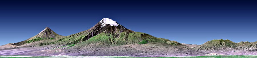 This perspective view shows Mount Ararat in easternmost Turkey, which has been the site of several searches for the remains of Noah's Ark. The main peak, known as Great Ararat, is the tallest peak in Turkey, rising to 5165 meters (16,945 feet). This southerly, near horizontal view additionally shows the distinctly conically shaped peak known as "Little Ararat" on the left. Both peaks are volcanoes that are geologically young, but activity during historic times is uncertain. This image was generated from a Landsat satellite image draped over an elevation model produced by the Shuttle Radar Topography Mission (SRTM). The view uses a 1.25-times vertical exaggeration to enhance topographic expression. Natural colors of the scene are enhanced by image processing, inclusion of some infrared reflectance (as green) to highlight the vegetation pattern, and inclusion of shading of the elevation model to further highlight the topographic features. Volcanoes pose hazards for people, the most obvious being the threat of eruption. But other hazards are associated with volcanoes too. In 1840 an earthquake shook the Mount Ararat region, causing an unstable part of mountain's north slope to tumble into and destroy a village. Visualizations of satellite imagery when combined with elevation models can be used to reveal such hazards leading to disaster prevention through improved land use planning. But the hazards of volcanoes are balanced in part by the benefits they provide. Over geologic time volcanic materials break down to form fertile soils. Cultivation of these soils has fostered and sustained civilizations, as has occurred in the Mount Ararat region. Likewise, tall volcanic peaks often catch precipitation, providing a water supply to those civilizations. Mount Ararat hosts an icefield and set of glaciers, as seen here in this late summer scene, that are part of this beneficial natural process Elevation data used in this image was acquired by the Shuttle Radar Topography Mission (SRTM) aboard the Space Shuttle Endeavour, launched on February 11, 2000. SRTM used the same radar instrument that comprised the Spaceborne Imaging Radar-C/X-Band Synthetic Aperture Radar (SIR-C/X-SAR) that flew twice on the Space Shuttle Endeavour in 1994. SRTM was designed to collect three-dimensional measurements of the Earth's surface. To collect the 3-D data, engineers added a 60-meter-long (200-foot) mast, installed additional C-band and X-band antennas, and improved tracking and navigation devices. The mission is a cooperative project between the National Aeronautics and Space Administration (NASA), the National Geospatial-Intelligence Agency (NGA) of the U.S. Department of Defense (DoD), and the German and Italian space agencies. It is managed by NASA's Jet Propulsion Laboratory, Pasadena, CA, for NASA's Earth Science Enterprise, Washington, DC.