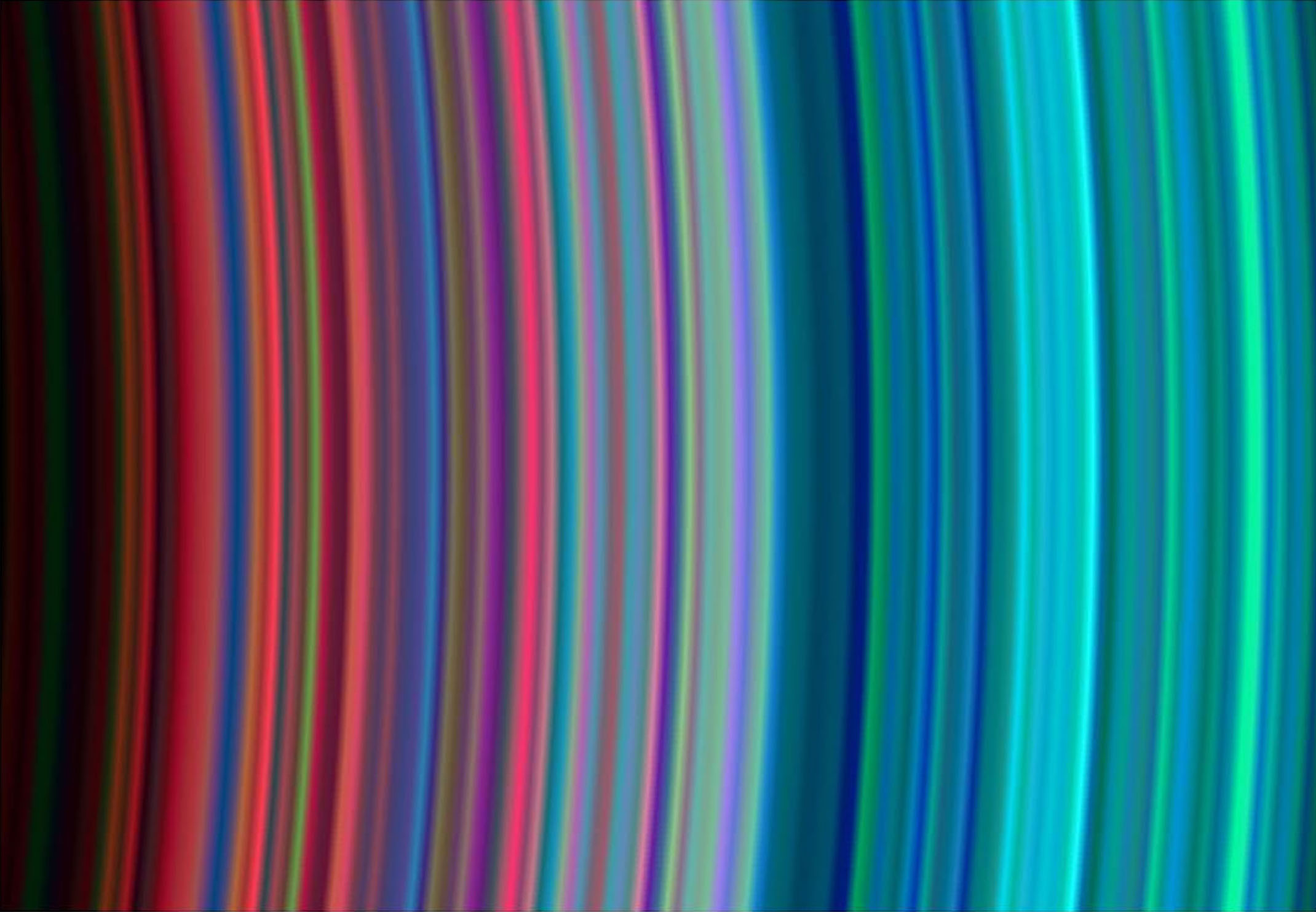 Images taken during the Cassini spacecraft's orbital insertion on June 30 show definite compositional variation within the rings. This image shows, from left to right, the outer portion of the C ring and inner portion of the B ring. The B ring begins a little more than halfway across the image. The general pattern is from "dirty" particles indicated by red to cleaner ice particles shown in turquoise in the outer parts of the rings. The ring system begins from the inside out with the D, C, B and A rings followed by the F, G and E rings. This image was taken with the Ultraviolet Imaging Spectrograph instrument, which is capable of resolving the rings to show features up to 97 kilometers (60 miles) across, roughly 100 times the resolution of ultraviolet data obtained by the Voyager 2 spacecraft. |