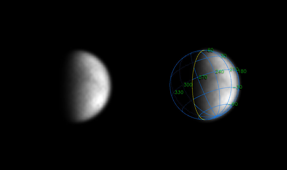 The Cassini orbiter continues its observations of Saturn's mysterious moon Titan, stealing another early peek at the haze-enshrouded surface. Cassini's view of Titan now surpasses Earth-based observations in its ability to show detail. Titan, Saturn's largest moon, is a prime target for the European-built Huygens probe onboard Cassini. Perpetually enshrouded by a hazy atmosphere, scientists believe Titan may harbor methane seas and organic chemicals, possibly like those on the early Earth. Huygens will be the first probe to descend to the surface of a moon of another planet, and is by far the most distant descent of a robotic probe ever attempted on another object in the solar system. The Cassini spacecraft was 29.3 million kilometers (18.2 million miles) from Titan on May 5, 2004, when the image on the left was taken through one of the narrow angle camera's spectral filters specifically designed to penetrate the moon's thick atmosphere. The image scale is 176 kilometers (109 miles) per pixel, an improvement in resolution of 30 percent over the images released on May 6. The image has been magnified 10 times and has been enhanced in contrast to bring out details. The mottled pattern is an artifact of the processing. The larger scale brightness variations are real. No further processing to remove the effects of the overlying atmosphere has been performed. The superimposed coordinate system grid in the accompanying image on the right illustrates the geographical regions of the moon that are illuminated and visible, as well as the orientation of Titan -- north is up and rotated 25 degrees to the left. The yellow curve marks the position of the boundary between day and night on Titan. This image shows about one quarter of Titan's surface, from 180 to 250 degrees west longitude, and overlaps part of the surface shown in the previous Cassini image release PIA05390. |