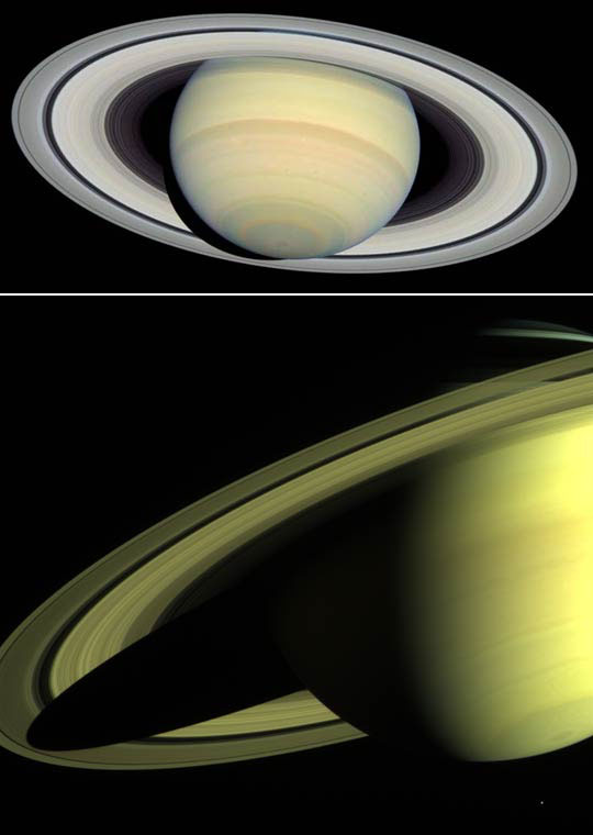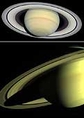 The top image is a view from NASA's Earth-orbiting Hubble Space Telescope taken on March 22, 2004. Camera exposures in four filters (blue, blue-green, green and red) were combined to form the Hubble image and render colors similar to what the eye would see through a telescope focused on Saturn. The subtle pastel colors of ammonia-methane clouds trace a variety of atmospheric dynamics. Saturn displays its familiar banded structure, with haze and clouds at various altitudes. Like Jupiter, all bands are parallel to Saturn's equator. The magnificent rings, at nearly their maximum tilt toward Earth, show subtle hues which indicate the trace chemical differences in their icy composition. To view the top image see PIA05982. The Cassini-Huygens spacecraft returned the bottom image of Saturn on May 16, 2004, when its imaging science subsystem narrow-angle camera was too close to fit the entire planet in its field-of-view. Cassini is still about 20 million kilometers (12.4 million miles) away and only 36 days from reaching Saturn. Cassini has two cameras, a wide angle and narrow angle. This narrow angle image was made using a combination of three filters (red, green, blue) and was taken at a range of 24.3 million kilometers (15.1 million miles). The view is from 13 degrees below the equator. Enceladus, one of Saturn’s 31 known moons, appears near the south pole at the bottom of the image. To view the bottom image see PIA05983. The color differences between the Hubble and Cassini images are mainly due to the different sets of filters used. |