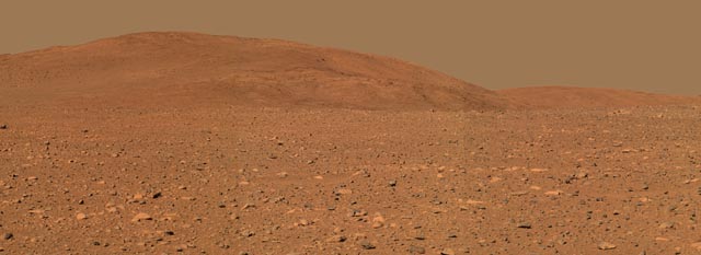 This approximate true-color rendering of the central part of the "Columbia Hills" was made using images taken by NASA's Mars Exploration Rover Spirit panoramic camera. Scientists plan to use the science instruments on the rover to analyze the composition of rock and soil at the hills," Spirit's planned destination. The images in this mosaic, acquired on sol 149 (June 3, 2004), were taken with the camera's 600, 530, and 480 nanometer filters from three rover positions approximately 300 meters (984 feet) away from the base of the hills. |