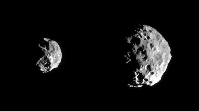 Early images returned from the first detailed reconnaissance of Saturn's small outer moon, Phoebe, show breathtaking details in the moon's pockmarked surface that already have imaging scientists puzzling over the body's history. The images are only a preview of what to expect from the high resolution images to be examined later today which will show details about 10 times smaller. Phoebe has revealed itself to be a rugged, heavily cratered body, with overlapping craters of varying sizes. This morphology suggests an old surface. There are apparently many craters smaller than 1 km, indicating that projectiles probably smaller than 100 meters once pummeled Phoebe. Whether these objects were cometary or asteroidal in origin, or were the debris that resulted from impacts on other bodies within the Saturn system, is hotly debated. There is also variation in surface brightness across the body. In the first image (at left) in which Phoebe looks somewhat like a sideways skull, the large crater near the bottom displays a complex and rugged interior. The lower right hand part of Phoebe appears to be covered by bright wispy material. The second, higher resolution image further reveals the moon's battered surface, including a crater near the right hand edge with bright rays that extend outward from its center. This suggests that dark material coats the outside. Features reminiscent of those seen on the Martian moon Phobos -- such as linear grooves--are faintly visible in the upper part of this image. There are suggestions of linear ridges or grooves and of chains of craters, perhaps radial to a large crater just hidden on the un-illuminated region in the upper left. Left to right, the two views were obtained at phase, or Sun-Phoebe-spacecraft, angles of approximately 86 degrees, and from distances ranging from 143,068 kilometers (88,918 miles) to 77,441 kilometers (48, 130 miles); for reference, Cassini's closest approach to Phoebe was approximately 2,068 kilometers (1,285 miles). The image scale ranges from 0.86 to 0.46 kilometers (0.53 to 0.29 miles) per pixel. No enhancement of any kind has been performed on the images. |