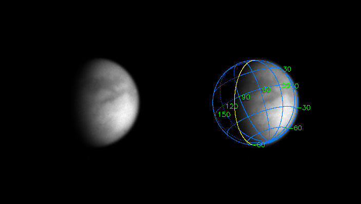 The Cassini spacecraft has beamed back a new, more detailed image of smog-enshrouded Titan. This view represents an improvement in resolution of nearly three times over the previous Cassini image release of Titan (see PIA05392). The superimposed coordinate system grid in the accompanying image at right illustrates the geographical regions of the moon that are illuminated and visible, as well as the orientation of Titan. North is up and rotated 25 degrees to the left. The yellow curve marks the position of the boundary between day and night on Titan. This image shows about one quarter of Titan's surface, from 0 to 70 degrees West longitude, and just barely overlaps part of the surface shown in the previous Titan image release. Most of the visible surface in this image has not yet been shown in any Cassini image. The image was obtained with the narrow angle camera on June 14, 2004, at a phase, or Sun-Titan-spacecraft, angle of 61 degrees and at a distance of 10.4 million kilometers (6.5 million miles) from Titan. The image scale is 62 kilometers (39 miles) per pixel. The image was magnified by a factor of two using a linear interpolation scheme. No further processing to remove the effects of the overlying atmosphere has been performed. The observed brightness variations are real, on scales of one hundred kilometers or less. The image was obtained in the near-infrared (centered at 938 nanometers) through a polarizing filter. The combination was designed to reduce the obscuration by atmospheric haze. The haze is more transparent at 938 nanometers than at shorter wavelengths, and light of 938 nanometers wavelength is not absorbed by methane gas in Titan's atmosphere. Light at this wavelength consequently samples the surface, and the polarizer blocks out light scattered mainly by the haze. This is similar to the way a polarizer, put on the front of a lens of a hand-held camera, makes distant objects more clear on Earth. |