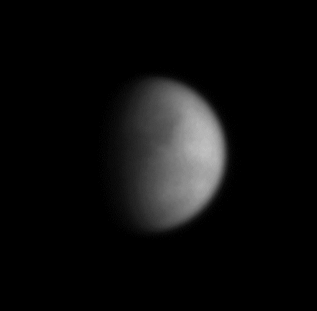 Cassini's piercing vision reveals a never-before-seen level of detail on Titan's surface as the moon executes nearly one complete rotation under the spacecraft's watchful gaze. Complex surface markings are visible. Dark, often linear markings, with seemingly preferred orientations, cover the moon's equatorial region, except throughout the large, bright Xanadu region. Such trends in surface features are often indicative of complex internal processes. Several individual bright regions, some with faint radial patterns, can be seen upon close inspection of the images, candidates for large recent cratering events. A persistent bright feature is also observed in the movie near the South polar region where ground-based astronomers had previously detected clouds. Cassini captured the 45 images comprising this movie in the near-infrared (938 nanometers) through a polarizer filter from June 2 and June 17, 2004, from distances ranging from 14.9 million kilometers (9.3 million miles) to 7.7 million kilometers (4.8 million miles). The Sun-Titan-spacecraft, or phase, angle ranges from 66 to 61 degrees. Most of the images have been re-sized so that Titan appears to have the same width throughout the movie. The image scale ranges from 89 to 46 kilometers (55 to 29 miles) per pixel. Contrast has been slightly enhanced for visibility. |