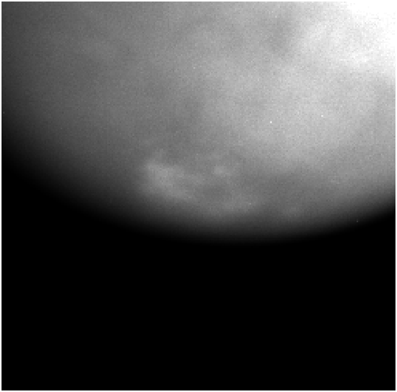 This animated gif of the south polar region of Titan was acquired over an 11.5-hour period on Oct. 23, 2004, as the Cassini spacecraft approached its first close encounter with Saturn's smoggy moon. The images were acquired with a near-infrared filter, which sees through the Titan stratospheric haze and reveals surface and lower tropospheric features. Aside from the slow rotation of the planet, a prominent polar cloud field often observed in ground-based images can be seen to evolve over the 11.5-hour period. The cloud evolution is complex and appears to include a general diverging motion. |