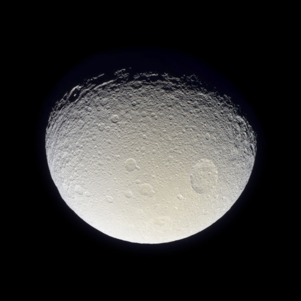 Having now passed closer to Tethys than the Voyager 2 spacecraft, Cassini has returned the best-ever natural color view of this icy Saturnian moon. As seen here, the battered surface of Tethys (1,060 kilometers, or 659 miles across) has a neutral hue. The image here is a mosaic of two footprints. Three images taken in the red, green and blue filters were taken to form a natural color composite. The result reveals a world nearly saturated with craters - many small craters lie on top of older, larger ones, suggesting an ancient surface. At the top and along the boundary between day and night, the moon's terrain has a grooved appearance. This moon is known to have a density very close to that of water, indicating it is likely composed mainly of water ice. Its frozen mysteries await Cassini's planned close flyby in September 2005. The view shows primarily the trailing hemisphere of Tethys, which is the side opposite the moon's direction of motion in its orbit. The image has been rotated so that north on Tethys is up. The images comprising this color view were taken with the Cassini spacecraft narrow angle camera on Oct. 28, 2004, at a distance of about 256,000 kilometers (159,000 miles) from Tethys and at a Sun-Tethys-spacecraft, or phase, angle of 50 degrees. The image scale is 1.5 kilometers (0.9 miles) per pixel. |