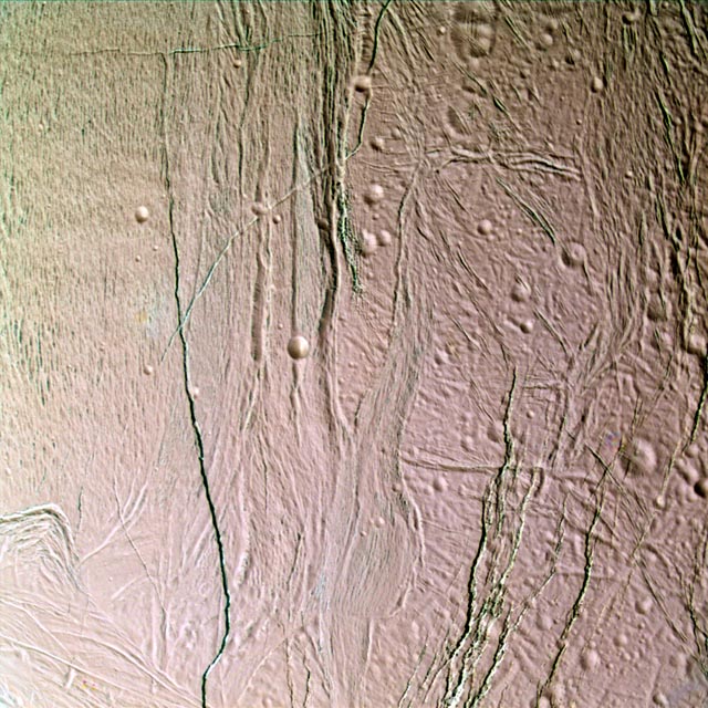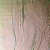 This false-color, close-up look at Saturn's moon Enceladus yields new insight into the different processes that have shaped the moon's icy surface. Extending through the center of this image is a system of rifts 3 kilometers wide (2 mile) and lanes of grooved terrain 20 kilometers wide (12 mile), which separate two distinct geological provinces. To the right of the boundary is older, cratered terrain - a region peppered with craters ranging from 10 kilometers (6 miles) in diameter, down craters near the limit of resolution. The region is believed to be old because it has accumulated a relatively high density of impact craters over time and the topography is soft and muted, suggesting that it is covered by a layer of particulate materials. The cratered terrain is cut crosswise by numerous faults and fractures ranging in width from hundreds of meters to a few kilometers. On the left side of the scene are grooved, icy plains. This broad, relatively flat region is scored by an extensive band of parallel grooves that appear to subdivide the surface into narrow lanes approximately 1 kilometer or half a mile wide. The low abundance of impact craters and crisp relief on topographic features here imply that this region is geologically much younger than the cratered terrain at the right. This view is a composite of images taken using filters sensitive to ultraviolet (centered at 338 nanometers), green (centered at 568 nanometers), and near-infrared (centered at 930 nanometers) light, and has been processed to accentuate subtle color differences. The uppermost surface of these terrains has a relatively uniform pinkish cast in this picture, suggesting that it is covered with materials of homogeneous composition and grain size. However, many of the fractures reveal a distinctly different color (represented by greenish tones in this false-color image) than the typical surface materials in this region. The fractures seem to penetrate down to a material that is texturally or compositionally different than most surface materials. One possibility is that the walls of the fractures expose outcrops of solid ice or ice with different grain-sizes compared to powdery surface materials that mantle flat-lying surfaces. It is also possible that the color identifies some compositional difference between buried ice and ice at the surface. The scene is located on the side of Enceladus that faces away from Saturn. The images were obtained with the Cassini spacecraft narrow-angle camera when the spacecraft was at a distance of approximately 25,700 kilometers (15,969 miles) from Enceladus and at a Sun-Enceladus-spacecraft, or phase, angle of 46 degrees. Resolution in the image is about 150 meters (490 feet) per pixel. |