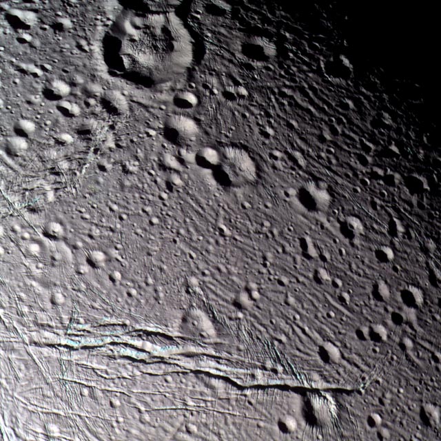 During its closest flyby of Saturn's wrinkled, icy moon Enceladus, Cassini obtained multi-spectral images of its cratered terrain that have been put together to create this false-color view. To human eyes, Enceladus appears almost completely white, but false color reveals intriguing details. This view is a composite of images taken using filters sensitive to ultraviolet (centered at 338 nanometers), green (centered at 568 nanometers), and near-infrared (centered at 930 nanometers) light, and has been processed to accentuate subtle color differences. The uppermost surface of these terrains appears uniformly grey in this picture, suggesting that they are covered with materials of homogeneous composition and grain size. However, the walls of many of the fractures appear to be somewhat bluer than typical surface materials. It is possible that the difference in color identifies outcrops of solid ice on the walls of fractures, or ice with different grain-sizes, compared to powdery surface materials. It is also possible that the color identifies some compositional difference between buried ice and ice at the surface. The surface is peppered with craters of all sizes, from the 21-kilometer (13-mile) diameter crater at the top of the image, down to tiny craters near the limit of resolution. The prominent crater at the top contains a central, domelike structure more than 11 kilometers (7 miles) in diameter. The dome, the crater--and indeed the entire scene--is sliced by a complex network of fractures ranging in width from hundreds of meters in some places, to over three kilometers (2 miles) in others. The prominent, complex fracture in the bottom of the frame extends over 85 kilometers (53 miles) in length across the field of view. From Cassini's oblique vantage point, the walls of the large fracture are clearly visible. A pervasive network of narrow, parallel grooves can be seen in many places in the image, and they appear to slice the surface into parallel slabs of ice approximately 500 meters (1,600 feet) in thickness. The image has been rotated so that north is at the top of the scene. The terrain in this scene is located on the side of Enceladus that faces away from Saturn, centered on latitude 28.7 north, longitude 192.5 west. The image was taken during Cassini's closest-ever approach to Enceladus on March 9, 2005. It was taken with the Cassini spacecraft narrow-angle camera at a distance of approximately 21,300 kilometers (13,200 miles) from Enceladus and at a Sun-Enceladus-spacecraft, or phase, angle of 45 degrees. Resolution in the image is about 130 meters (430 feet) per pixel. |