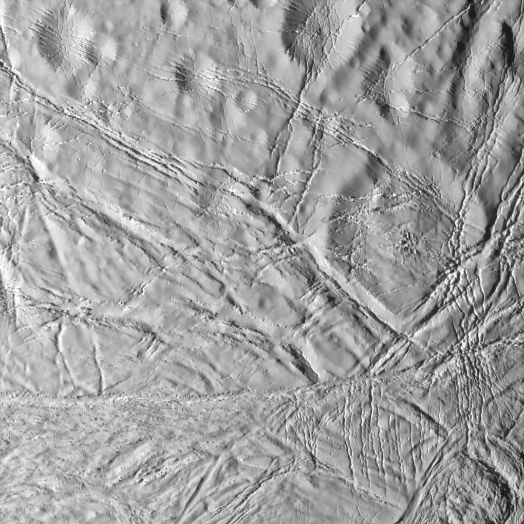 This dramatic scene from Cassini illustrates an array of processes on Saturn's moon Enceladus, a once geologically active world. Most of the larger craters appear to have softened from their original, presumably crisp appearance, and are cross-cut here by numerous faults. Cassini acquired this high-resolution view of Enceladus during its closest encounter yet with any moon of Saturn. Toward the bottom of the scene, terrain containing fractured and softened craters gives way to essentially non-cratered terrain consisting of tectonic faults. The softened craters, fractured plains and wrinkled terrain on Enceladus suggest geologic activity has taken place in several episodes during the satellite's history. This activity might continue into the present time, although imaging team scientists have seen no evidence for current activity on the moon. Illumination of the scene is from the left. The image was obtained in visible light with the Cassini spacecraft narrow-angle camera on July 14, 2005, at a distance of about 11,500 kilometers (7,150 miles) from Enceladus, and at a Sun-Enceladus-spacecraft, or phase, angle of 46 degrees. The image scale is 67 meters (220 feet) per pixel. The image's contrast has been enhanced to aid visibility of surface features. |