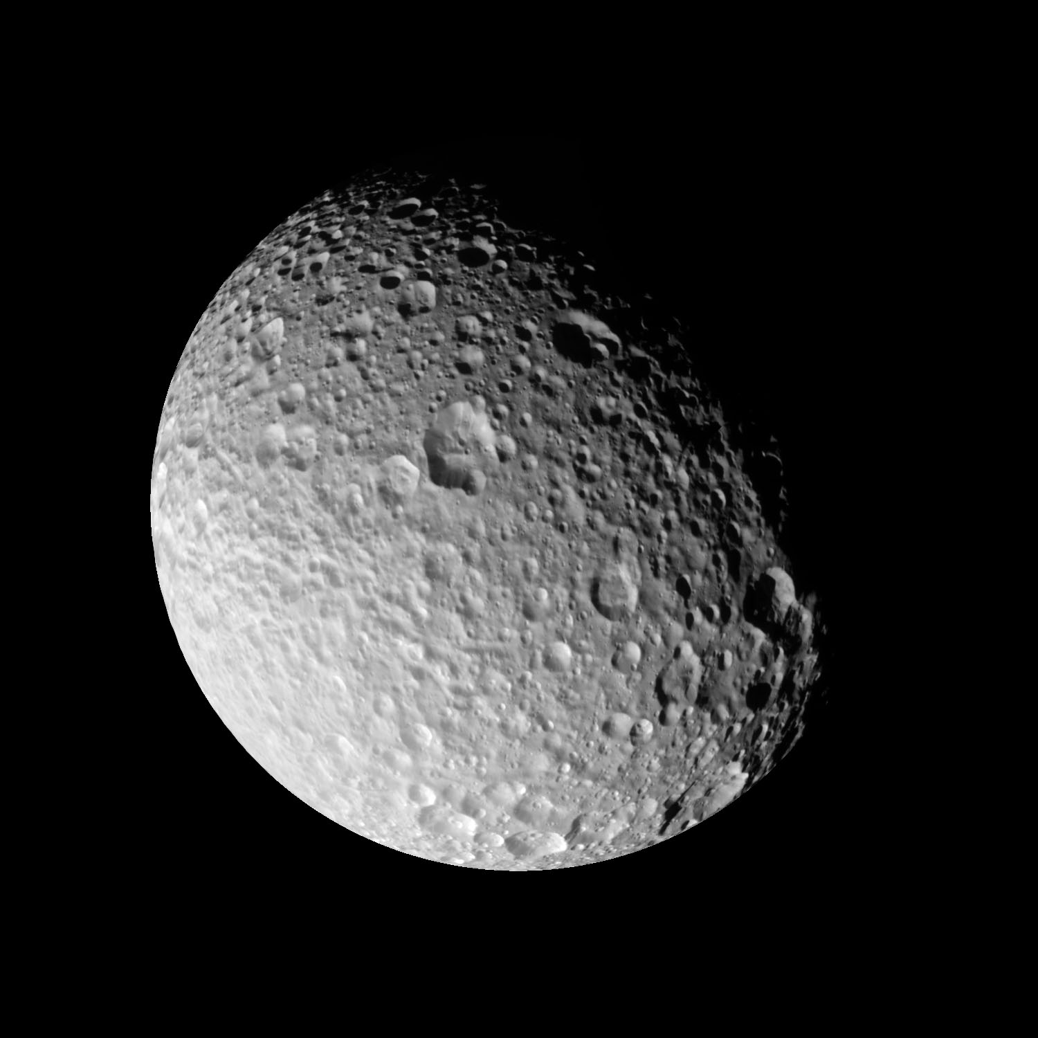 The most detailed images ever taken of Saturn's moon Mimas show it to be one of the most heavily cratered Saturnian moons, with little if any evidence for internal activity. Mimas has been so heavily cratered that new impacts can only overprint or even completely obliterate other older craters. Mimas is 397 kilometers or (247 miles) across. The moon displays an unexpected array of crater shapes. The highest crater walls tower 6 kilometers (4 miles) above the floors and show signs of material sliding down slope. Indeed, many of the large craters -- more than 15 kilometers (10 miles) in diameter -- appear to be filled in with rough-surfaced material, likely the result of landslides triggered by subsequent impacts elsewhere on Mimas' surface. Some of these deposits have craters superimposed on them, demonstrating that the landslides themselves may be quite old. Grooves, some of which are over a kilometer deep, cut across the surface for more than 100 kilometers (63 miles). These are some of the only indications that there might have once been internal activity under this ancient, battered surface. |