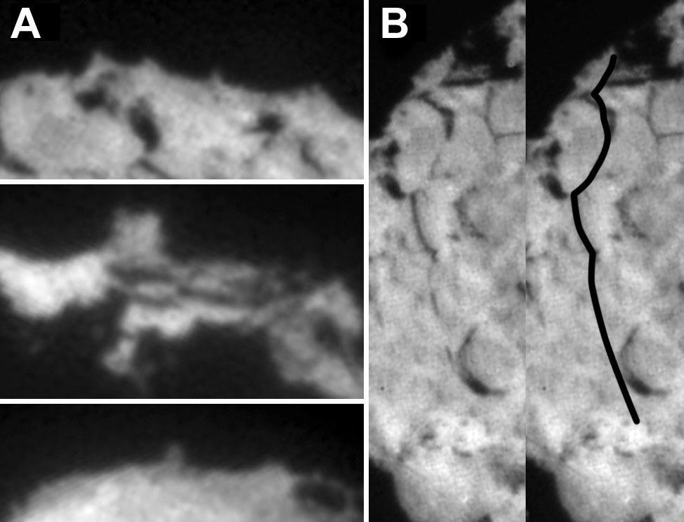 These images taken by NASA's Stardust spacecraft highlight the diverse features that make up the surface of comet Wild 2. Side A shows a variety of small pinnacles and mesas seen on the limb of the comet. Side B shows the location of a 2-kilometer (1.2-mile) series of aligned scarps, or cliffs, that are best seen in the stereo images. |