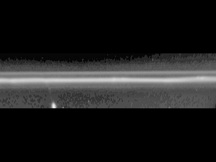 This image taken by the narrow angle camera on the Cassini spacecraft shows Saturn's F ring. It was re-projected to appear as a straight line. The bright object to the lower left is the moon Prometheus, which appears elongated due to the re-projection. A faint stream of material, or streamer, appears to be connecting the moon to the ring. This streamer probably formed when Prometheus bobbed up and down in its orbit around Saturn and caused periodic perturbations to the F ring. The vertical scale is from 139, 000 kilometers to 141,000 kilometers (86,300 miles to 87,600 miles). The horizontal scale is 20 degrees, or one-eighteenth of the entire F ring. This image was taken in mid-June, 2004. |