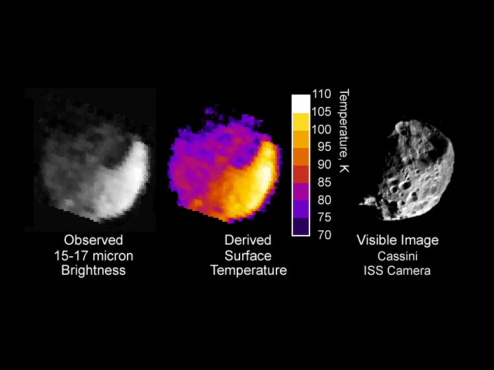 This image shows thermal radiation from the day and night sides of Saturn's moon Phoebe, taken by the composite infrared spectrometer onboard Cassini 1.8 hours before the spacecraft's closest approach to Phoebe on June 11, 2004. The left-hand panel displays the image in grayscale format, showing the brightness of Phoebe's radiation in the wavelength range 15-17 microns, which is about 25 times the longest wavelength visible to the naked eye. In the middle panel this brightness is used to estimate the surface temperature distribution across Phoebe. Temperatures are given in degrees Kelvin, and vary from a relatively toasty 107 Kelvin (-267 Fahrenheit), in the late morning near the equator (white, lower right), to less than 75 Kelvin (-324 Fahrenheit) in the northern hemisphere in the pre-dawn hours (dark blue, upper left). The "ragged edge" of Phoebe in this region is an instrumental artifact. Temperatures are affected strongly by topography, as can be seen by comparison with the visible-wavelength image (right). Some of the coldest temperatures are found in the shadowed region inside the large depression in the northern hemisphere (upper right). |