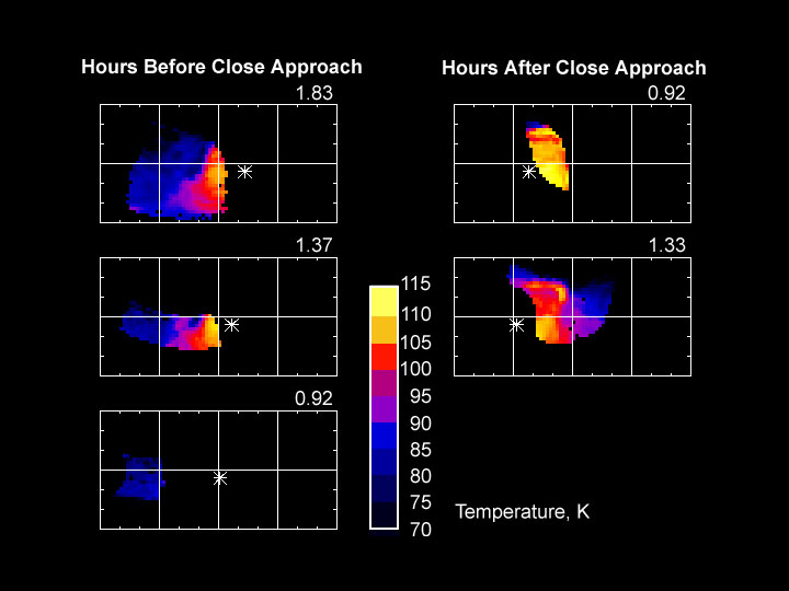 A montage of maps of Saturn's moon Phoebe shows surface temperatures at various times of day as determined by the composite infrared spectrometer onboard Cassini during the June 11, 2004, Phoebe flyby. The asterisk on each map shows the location of the subsolar point, where the Sun is directly overhead. This point moves across the surface as Phoebe rotates. It is morning in regions to the left of the subsolar point, and afternoon in regions to the right. Like a newspaper weather map, different colors indicate different temperatures, though Phoebe's temperatures are distinctly cooler than even the coldest January day on Earth. Equatorial temperatures peak in the early afternoon near 112 Kelvin (-257 Fahrenheit), plunging to 78 Kelvin (-319 Fahrenheit) before dawn, and are even colder at higher latitudes. The large day/night temperature contrasts imply that Phoebe's surface is covered in loose dust or ice particles that store little heat and thus cool off rapidly at night. Regions of Phoebe's surface that were not observed are shown in black. Most of the maps show the effect on surface temperatures of the large crater-like depression seen in Cassini's visible-wavelength images of Phoebe, which is located just left of center in these maps. Crater walls that are shadowed and cold in the early morning in the first map are sunlit and warm in the late afternoon in the final map. |