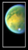 Piercing the ubiquitous layer of smog enshrouding Titan, these images from the Cassini visual and infrared mapping spectrometer reveals an exotic surface covered with a variety of materials in the southern hemisphere. Using near-infrared colors -- some three times deeper in the red visible to the human eye -- these images reveal the surface with unusual clarity. The color image shows a false-color combination of the three previous images (see PIA06405). The yellow areas correspond to the hydrocarbon-rich regions, while the green areas are the icier regions. Here, the methane cloud appears white, as it is bright in all three colors. |