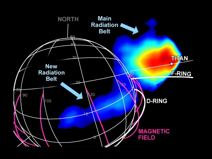 The magnetospheric imaging instrument onboard Cassini recently discovered a new radiation belt just above Saturn's cloud tops, up to the inner edge of the D-ring. Before this discovery, it was not anticipated that such a trapped ion population could be sustained inside the rings. This new radiation belt extends around the planet. It was detected by the emission of fast neutral atoms created as its energetic ions interact with gas clouds in the same region. Saturn's radiation belts have numerous "holes" in them, created as the trapped ions collide with moons, dust ring, and gas. With this discovery, the radiation belts are shown to extend far closer to the planet than their previously known inner boundary, which lies just at the outer edge of the main ring system. The new belts are much smaller and much less energetic than the main radiation belts. The main belts extend from about 139,000 kilometers (86,000 miles) from Saturn's center out to about 362,000 (225,000 miles) and contain particles with energies up to tens of mega-electron volts. The new belt extends less than 6,000 kilometers (about 4,000 miles) in thickness, and is not known to contain particles above about 150 kilo-electron Volts total energy. Shown here is an image taken by the magnetospheric imaging instrument on July 1, 2004, from a distance of 24,000 kilometers (14,900 miles) from Saturn's cloud tops. From blue to red the colors represent increasing intensity of the radiation. The location of the moon Titan in the image is shown, but emissions associated with Titan itself are too weak to stand out in the intense emission from the main radiation belt. The magenta lines represent the magnetic field lines that cross the equator just at the inner edge of the D-Ring, where the new-found radiation belt resides. |