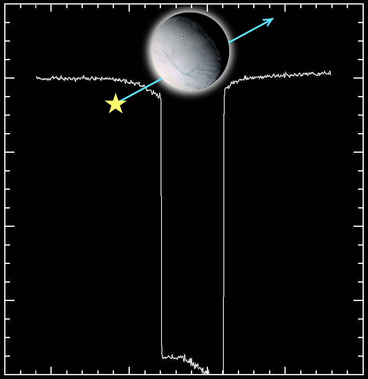 During the July 14, 2005, flyby of Saturn's moon Enceladus, Cassini's ultraviolet imaging spectrograph made the first direct detection of an atmosphere, first suggested by Cassini magnetometer measurements. The ultraviolet imaging spectrograph observed the star Gamma Orionis as Enceladus crossed in front of the star. The light of the star dimmed as it was obscured by the atmosphere before being blocked entirely by Enceladus itself. The spectrum of the starlight changed as it passed through the atmosphere, indicating the presence of water vapor. The ultraviolet imaging spectrograph results suggest that the atmosphere of Enceladus is not constant and may be consistent with a greater amount of atmospheric gas near the south polar region. The presence of water vapor is more consistent with warm water ice than with magnetospheric sputtering. |