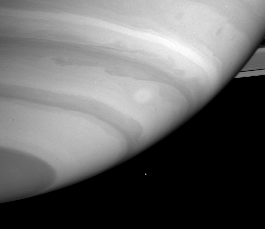 Tiny Mimas is dwarfed by a huge white storm and dark waves on the edge of a cloud band in Saturn's atmosphere. Although the east-west winds on Saturn are stronger than on Earth or even Jupiter, the contrast in appearance between these zones is more muted, and the departures of the wind speeds from east to west are lower. The image was taken with the Cassini spacecraft narrow angle camera on Sept. 25, 2004, at a distance of 7.8 million kilometers (4.8 million miles) from Saturn through a filter sensitive to wavelengths of infrared light centered at 727 nanometers. The image scale is 46 kilometers (29 miles) per pixel. |