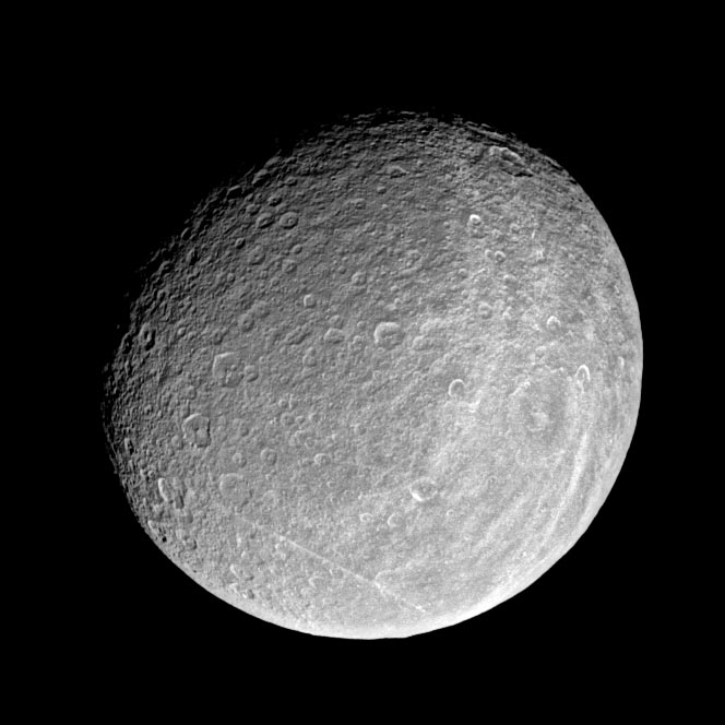 This view of the trailing hemisphere of Saturn's moon Rhea shows the region's bright wispy markings, but also shows off the moon's craters in great detail. Of particular interest to imaging scientists is the distribution and orientation of the many craters with polygonal rims. These are craters with rough, angular shapes, rather than smooth, circular ones. Rhea is 1,528 kilometers (949 miles) across. This image was taken in visible light with the Cassini spacecraft narrow angle camera on Jan. 16, 2005, at a distance of approximately 500,000 kilometers (311,000 miles) from Rhea and at a Sun-Rhea-spacecraft, or phase, angle of 35 degrees. (PIA06578 is a true color version of this image.) Resolution in the original image was about 3 kilometers (2 miles) per pixel. The image has been rotated so that north on Rhea is up. Contrast was enhanced and the image was magnified by a factor of two to aid visibility. |