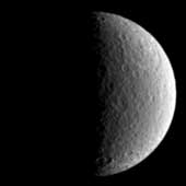The large Tirawa impact basin on Saturn's moon Rhea is visible at the two o'clock position in this Cassini image. Rhea is 1,528 kilometers (949 miles) across. This view shows principally the trailing hemisphere on Rhea, and is centered on the moon's equator. North is up and tilted 25 degrees to the left. The image was taken with the Cassini spacecraft narrow-angle camera on March 13, 2005, through a filter sensitive to wavelengths of ultraviolet light centered at 338 nanometers. The image was obtained at a distance of approximately 1.7 million kilometers (1.1 million miles) from Rhea and at a Sun-Rhea-spacecraft, or phase, angle of 90 degrees. Resolution in the original image was 10 kilometers (6 miles) per pixel. The image has been contrast-enhanced and magnified by a factor of two to aid visibility. |