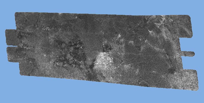This radar image of the surface of Saturn's moon Titan was acquired on October 26, 2004, when the Cassini spacecraft flew approximately 1,600 kilometers (994 miles) above the surface and acquired radar data for the first time. Brighter areas may correspond to rougher terrains and darker areas are thought to be smoother. This image highlights some of the darker terrain, which the Cassini team has nicknamed "Si-Si the Cat" after a team member's daughter, who pointed out its cat-like appearance. The interconnected dark spots are consistent with a very smooth or highly absorbing solid, or could conceivably be liquid. The image is about 250 kilometers (155 miles) wide by 478 kilometers (297 miles) long, and is centered at 50 N, 54 W in the northern hemisphere of Titan, over a region that has not yet been imaged optically. The smallest details seen on the image vary from about 300 meters (984 feet) to 1 kilometer (.62 mile). The data were acquired in the synthetic aperture radar mode of Cassini's radar instrument. In this mode, radio signals are bounced off the surface of Titan. |