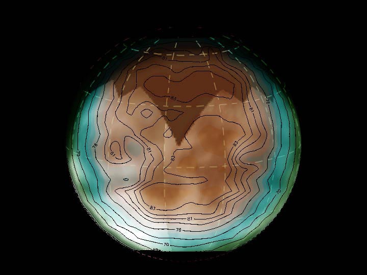 This image shows Titan data from the passive radiometer mode of Cassini's radar instrument overlaid onto a visible-light image mosaic from the spacecraft's imaging science subsystem. The contours and colors show Titan's radiation at microwave wavelengths (about two centimeters or 0.79 inch), while the light and dark shading is from the optical image. This microwave radiation comes directly from Titan itself, rather than being a reflection from the Sun as detected in visible-light images. The microwave brightness tells us about surface properties such as temperature composition and roughness. The brightness decreases when the angle of the surface is tilted from the viewer, causing the edges of Titan's disc to look dark relative to the center even though they are probably at the same temperature. Since the variations in brightness are likely larger than variations in physical temperature, they are probably due to compositional or structural properties of the surface. There is a significant correlation between areas that are bright in the microwave and dark in the optical, and vice versa. Comparison of data sets will help determine the causes of these variations. The radar data was taken on Oct. 26, 2004, during Cassini's first close encounter with Titan. The imaging science subsystem data was acquired on approach to the moon. |