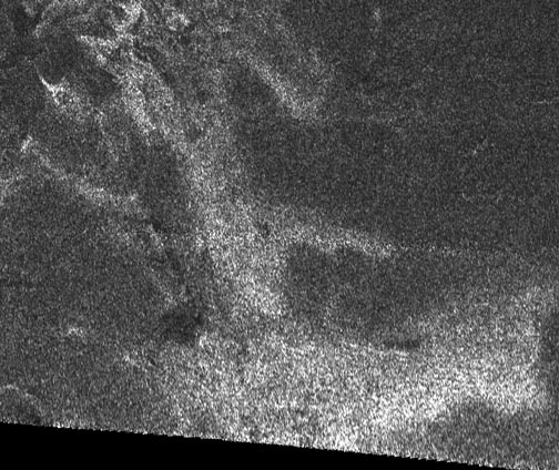 This synthetic aperture radar image of the surface of Saturn's moon Titan was acquired on Oct. 26, 2004, when the Cassini spacecraft flew approximately 2,500 kilometers (1,553 miles) above the surface and acquired radar data for the first time. The radar illumination was from the south: dark regions may represent areas that are smooth, made of radar-absorbing materials, or are sloped away from the direction of illumination. A striking bright feature stretches from upper left to lower right across this image, with connected 'arms' to the East. The fact that the lower (southern) edges of the features are brighter is consistent with the structure being raised above the relatively featureless darker background. Comparisons with other features and data from other instruments will help to determine whether this is a cryovolcanic flow, where water-rich liquid has welled up from Titan's warm interior. The image covers an area about 150 kilometers (90 miles) square, and is centered at about 45 degrees north, 30 degrees west in the northern hemisphere of Titan, over a region that has not yet been imaged optically. The smallest details seen on the image are around 1 kilometer (.62 mile) across. Features are less clear at the bottom of the image where the viewing was less favorable. A faint horizontal seam between the radar beams can be seen half way up in this image. |