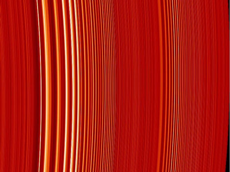 This false color image of two density waves in Saturn's A ring was made from the stellar occultation observed by Cassini's ultraviolet imaging spectrograph when the spacecraft was 6.8 million kilometers (4.2 million miles) from Saturn. Bright areas indicate the denser regions of the rings. The bright bands in the left part of the image are the "peaks" of a density wave caused by gravitational stirring of the rings by Saturn's moon, Janus. A smaller density wave in the right half of the image is produced by the moon Pandora. The ultraviolet imaging spectrograph observed the brightness of the star Xi Ceti as the rings passed in front of it, and the flickering of the starlight was converted into the ring density depicted by the image. The image represents a distance of about 724 kilometers (450 miles), and the smallest features are about one-half mile across. |