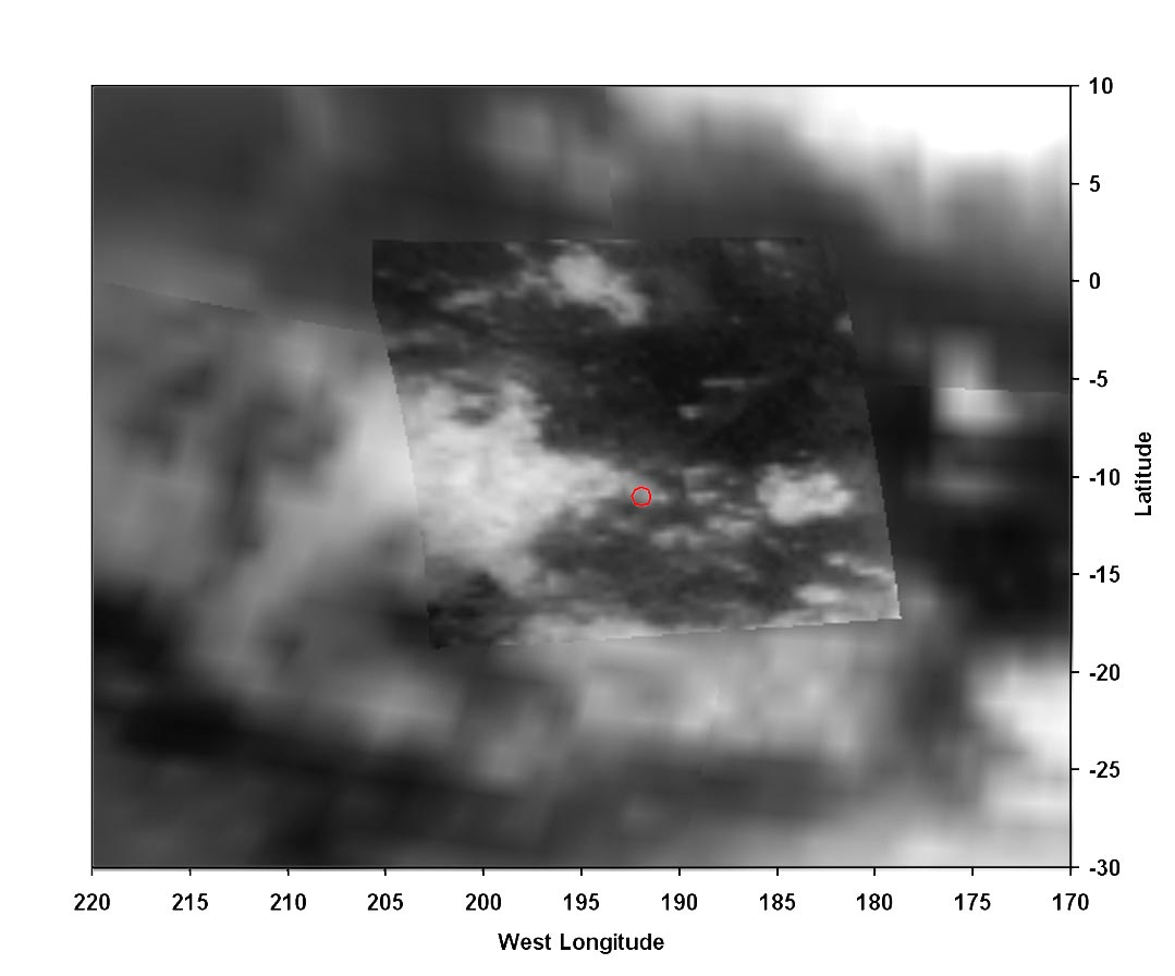A view of Titan from the visual and infrared mapping spectrometer instrument on the Cassini orbiter. The Huygens probe landed in the small red circle on the boundary of the bright and dark regions. The size of the circle shows the field of view of the Huygens Descent Imager/Spectral Radiometer (DISR) instrument from an altitude of 20 kilometers (about 12 miles). |