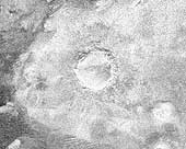 This image shows a crater, approximately 60 kilometers (37 miles) in diameter, on the very eastern end of the radar image strip taken by the Cassini orbiter on its third close flyby of Titan on Feb. 15. The appearance of the crater and the extremely bright (hence rough) blanket of material surrounding it is indicative of an origin by impact, in which a hypervelocity comet or asteroid, in this case, roughly 5-10 kilometers (3-6 miles) in size, slammed into the surface of Titan. The bright surrounding blanket is debris, or ejecta, thrown out of the crater. The asymmetric appearance of this ejecta blanket could be an effect of atmospheric winds associated with the impact itself. Although clearly formed by impact, the feature lacks a central peak, suggesting that it has been eroded or otherwise modified after formation. Rainfall, wind erosion, and softening of the solid material in which the crater formed are all possible processes that might have altered this impact feature. The Cassini-Huygens mission is a cooperative project of NASA, the European Space Agency and the Italian Space Agency. The Jet Propulsion Laboratory, a division of the California Institute of Technology in Pasadena, manages the Cassini-Huygens mission for NASA's Science Mission Directorate, Washington, D.C. The Cassini orbiter and its two onboard cameras were designed, developed and assembled at JPL. The radar instrument team is based at JPL, working with team members from the United States and several European countries.
