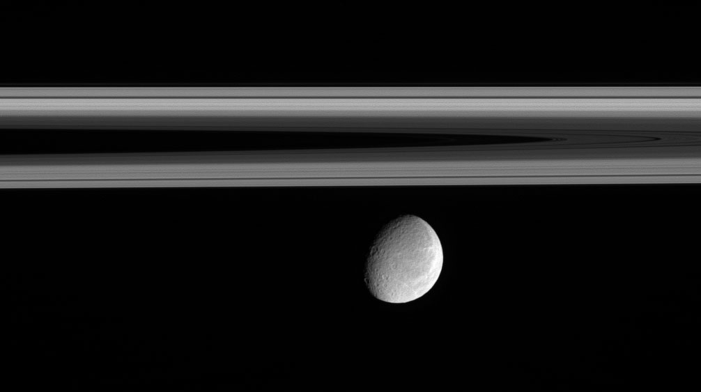 Rhea floats below the innermost regions of Saturn's amazing rings. This view of the Saturn-facing hemisphere of Rhea (1,528 kilometers, or 949 miles across) allows a glimpse of the wispy terrain that covers the trailing hemisphere of Rhea. (See PIA06575) & PIA06578) for similar views of the wispy terrain.) The image was taken in visible light with the Cassini narrow-angle camera on Oct. 9, 2005, at a distance of approximately 1.9 million kilometers (1.2 million miles) from Rhea and at a Sun-Rhea-spacecraft, or phase, angle of 51 degrees. The image scale is 12 kilometers (7 miles) per pixel. |