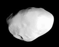 The Cassini spacecraft passed within a cosmic stone's throw of Telesto in October, 2005 capturing this shot of the tiny Trojan moon. Telesto (24 kilometers, or 15 miles across) appears to be mantled in fine, icy material, although a few craters and some outcrops and/or large boulders are visible. Its smooth surface does not appear to retain the record of intense cratering that most of Saturn's other moons possess. The image was taken in polarized green light with the Cassini spacecraft narrow-angle camera on Oct. 11, 2005, at a distance of approximately 14,500 kilometers (9,000 miles) from Telesto. The image scale is 86 meters (283 feet) per pixel. |
