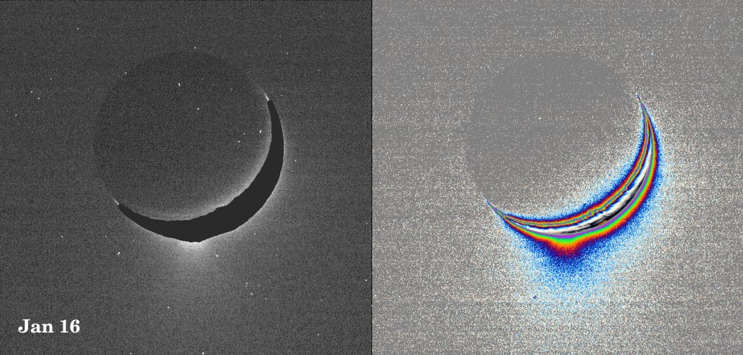 A fine spray of small, icy particles emanating from the warm, geologically unique province surrounding the south pole of Saturn's moon Enceladus was observed in a Cassini narrow-angle camera image of the crescent moon taken on Jan. 16, 2005. Taken from a high phase angle of 148 degrees - a viewing geometry in which small particles become much easier to see - the plume of material becomes more apparent in images processed to enhance faint signals. Imaging scientists have measured the light scattered by the plume's particles to determine their abundance and fall-off with height. Though the measurements of particle abundance are more certain within 100 kilometers (60 miles) of the surface, the values measured there are roughly consistent with the abundance of water ice particles made by other Cassini instruments (reported in September 2005) at altitudes as high as 400 kilometers (250 miles) above the surface. At present, it is not clear if the plume particles emanating from the south pole arises because of water vapor escaping from warm ice that is exposed to the surface. Another possibility is that at some depth beneath the surface, the temperatures are hot enough for water to become liquid, which then, under pressure, escapes to the surface like a cold Yellowstone geyser. The image at the left was taken in visible green light. A dark mask was applied to the moon's bright limb to make the plume feature easier to see. The image at the right has been color-coded to make faint signals in the plume more apparent. Images of other moons, such as Tethys and Mimas, taken in the last 10 months from similar lighting and viewing geometries, and with identical camera parameters, were closely examined to demonstrate that the plume towering above Enceladus' south pole is real and not a camera artifact. The images were acquired at a distance of about 209,400 kilometers (130,100 miles) from Enceladus. Image scale is about 1 kilometer (0.6 mile) per pixel. |