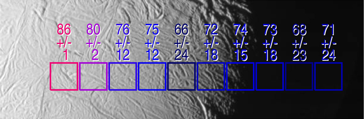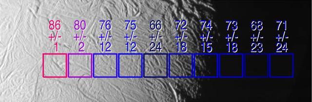 The exciting mystery of an active south polar region on Saturn's icy moon Enceladus continues to unfold as scientists make the correlation between geologically youthful surface fractures and unusually warm temperatures. This view shows excess heat radiation from cracks near the moon's south pole. These warm fissures are the source of plumes of dust and gas seen by multiple instruments on the Cassini spacecraft during its flyby of Enceladus on July 14, 2005, as described in a series of papers in the March 10, 2006, issue of the journal Science. This image shows two arrays of temperature readings across the surface of Enceladus, as measured by the Cassini composite infrared spectrometer, superimposed on images of the surface taken simultaneously by the imaging science subsystem. Surface temperatures in Kelvin, derived from the intensity of infrared radiation detected by the composite infrared spectrometer, are shown along with their formal uncertainties, although true uncertainties for temperatures below about 75 Kelvin (minus 325 degrees Fahrenheit) are not easily described by a single number. Enhanced thermal emission is seen in the vicinity of the prominent "tiger stripe" fissures discovered by the imaging cameras. In this image, the excess emission is most strongly seen in the left-most composite infrared spectrometer field of view, which includes a fissure near the end of one of the tiger stripes. The peak temperatures, 86 Kelvin and 90 Kelvin (minus 305 and minus 298 degrees Fahrenheit) respectively, are averages over the composite infrared spectrometer field of view, and other composite infrared spectrometer data suggest that much higher temperatures, up to at least 145 Kelvin (minus 199 degrees Fahrenheit), occur in narrow zones a few hundred meters wide along the tiger stripe fissures. See PIA07794 for a related image. This image is centered near longitude 135 west, latitude 65 south, and each square from the composite infrared spectrometer field of view is 17.5 kilometers (10.9 miles) across. This Cassini narrow-angle camera image has been cropped and resized for presentation. |