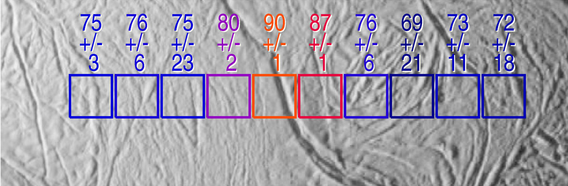 The exciting mystery of an active south polar region on Saturn's icy moon Enceladus continues to unfold as scientists make the correlation between geologically youthful surface fractures and unusually warm temperatures. This view shows excess heat radiation from cracks near the moon's south pole. These warm fissures are the source of plumes of dust and gas seen by multiple instruments on the Cassini spacecraft during its flyby of Enceladus on July 14, 2005, as described in a series of papers in the March 10, 2006, issue of the journal Science. This image shows two arrays of temperature readings across the surface of Enceladus, as measured by the Cassini composite infrared spectrometer, superimposed on images of the surface taken simultaneously by the imaging science subsystem. Surface temperatures in Kelvin, derived from the intensity of infrared radiation detected by composite infrared spectrometer, are shown along with their formal uncertainties, although true uncertainties for temperatures below about 75 Kelvin (minus 325 degrees Fahrenheit) are not easily described by a single number. Enhanced thermal emission is seen in the vicinity of the prominent "tiger stripe" fissures discovered by the imaging cameras. In this image, the excess emission is near the center of the composite infrared spectrometer array, directly over a tiger stripe fissure. The peak temperatures, 86 Kelvin and 90 Kelvin (minus 305 and minus 298 degrees Fahrenheit) respectively, are averages over the composite infrared spectrometer field of view, and other composite and infrared spectrometer data suggest that much higher temperatures, up to at least 145 Kelvin (minus 199 degrees Fahrenheit), occur in narrow zones a few hundred meters wide along the tiger stripe fissures. See PIA07793 for a related image. This image was taken nearly three times closer to the moon and is centered near longitude 120 west, latitude 82 south, and each composite infrared spectrometer field of view is 6.0 kilometers (3.7 miles) across. This Cassini narrow-angle camera image was cropped and resized for presentation. |