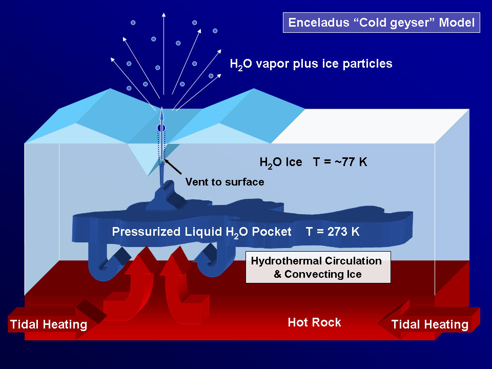 As Saturn's active moon Enceladus continues to spew icy particles into space, scientists struggle to understand the mechanics of what is going on beneath the fractured south polar terrain. This graphic illustrates key aspects of the model proposed by the Cassini imaging science team in a paper published in the journal Science on March 10, 2006. The model shows how proposed underground reservoirs of pressurized liquid water above 273 degrees Kelvin (0 degrees Celsius) could fuel geysers that send jets of icy material into the skies above the moon's south pole. In the graphic, the vent to the surface pierces one of the "tiger stripe" fractures seen in Cassini views of the southern polar terrain (see PIA06247 for a look at the tiger stripes). Temperatures increase with depth. Some combination of internal radioactive decay and flexing -- perhaps concentrated within the tiger stripe fractures and brought about by the particular characteristics of Enceladus' orbit--is implicated as the source of the heat creating the liquid reservoirs. However, it is not yet clear how the deep interior of Enceladus functions, nor whether the moon is fully differentiated (separated into layers, with rock at the center and ice outside). |