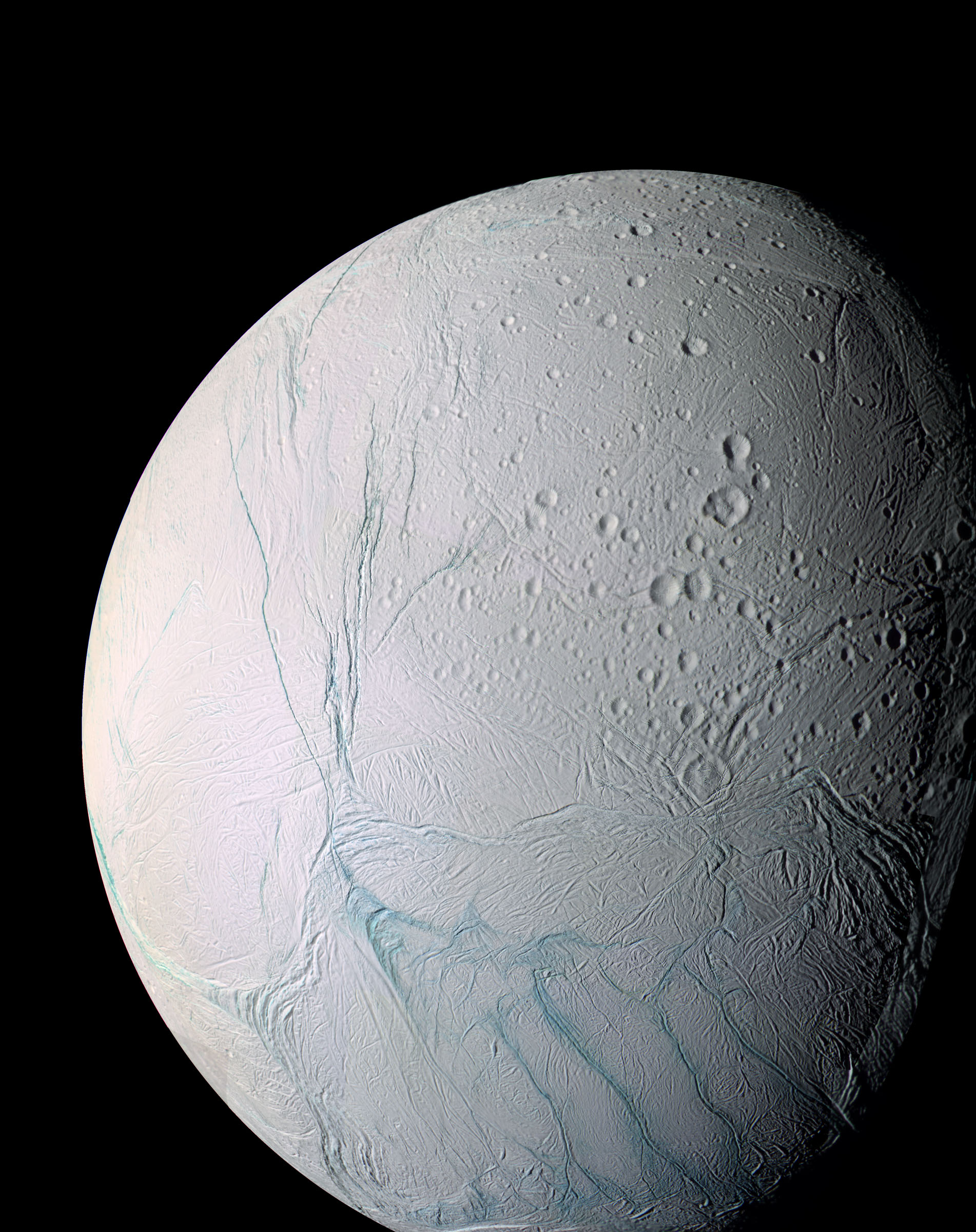 A masterpiece of deep time and wrenching gravity, the tortured surface of Saturn's moon Enceladus and its fascinating ongoing geologic activity tell the story of the ancient and present struggles of one tiny world. This is a story that is recounted by imaging scientists in a paper published in the journal Science on March 10, 2006. The enhanced color view of Enceladus seen here is largely of the southern hemisphere and includes the south polar terrain at the bottom of the image. Ancient craters remain somewhat pristine in some locales, but have clearly relaxed in others. Northward-trending fractures, likely caused by a change in the moon's rate of rotation and the consequent flattening of the moon's shape, rip across the southern hemisphere. The south polar terrain is marked by a striking set of `blue' fractures and encircled by a conspicuous and continuous chain of folds and ridges, testament to the forces within Enceladus that have yet to be silenced. The mosaic was created from 21 false-color frames taken during the Cassini spacecraft's close approaches to Enceladus on March 9 and July 14, 2005. Images taken using filters sensitive to ultraviolet, visible and infrared light (spanning wavelengths from 338 to 930 nanometers) were combined to create the individual frames. The mosaic is an orthographic projection centered at 46.8 degrees south latitude, 188 degrees west longitude, and has an image scale of 67 meters (220 feet) per pixel. The original images ranged in resolution from 67 meters per pixel to 350 meters (1,150 feet) per pixel and were taken at distances ranging from 11,100 to 61,300 kilometers (6,900 to miles) from Enceladus. |