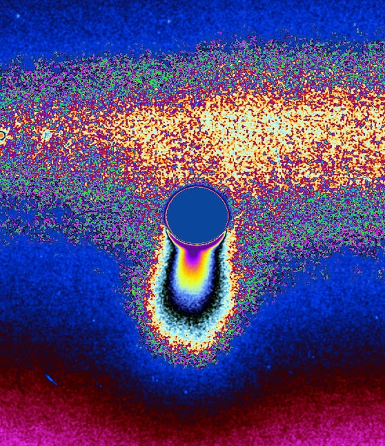 The ice jets of Enceladus send particles streaming into space hundreds of kilometers above the south pole of this spectacularly active moon. Some of the particles escape to form the diffuse E ring around Saturn. This color-coded image was processed to enhance faint signals, making the contours and extent of the fainter, larger-scale component of the plume easier to see. The bright strip behind and above Enceladus (505 kilometers, 314 miles across) is the E ring, in which this intriguing body resides. The small round object at far left is a background star. The image was taken in visible light with the Cassini spacecraft narrow-angle camera on March 24, 2006 at a distance of approximately 1.9 million kilometers (1.2 million miles) from Enceladus and at a Sun-Enceladus-spacecraft, or phase, angle of 162 degrees. Image scale is 11 kilometers (7 miles) per pixel. |