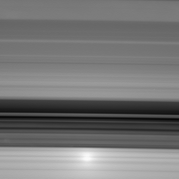 A brilliant spot of sunlight, the opposition effect, travels outward across the rings as the Cassini spacecraft orbits Saturn. This surge in ring brightness is created around the point directly opposite the Sun from the spacecraft. This movie sequence of 29 images shows the opposition surge moving from the outer B ring, across the sparsely populated Cassini Division and onto the A ring. From Cassini's perspective, the rings are seen projected onto the planet where the ring shadows can be seen through the rings. This perspective, including rings and ring shadows, changes continuously during the sequence, giving the false impression that the ring features themselves are changing. This image sequence was taken over 15 minutes on Aug. 16, 2006. The images were acquired in visible light with the Cassini spacecraft wide-angle camera at a distance of approximately 253,000 kilometers (157,000 miles) from Saturn. Image scale is 15 kilometers (9 miles) per pixel. |