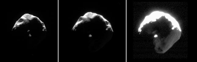 This set of images exposes details on small and crumpled-looking Helene. Large portions of this Trojan moon of Dione appear to have been blasted away by impacts. Cassini passed within 50,000 kilometers (31,000 miles) of Helene (32 kilometers, or 20 miles across) on Aug. 17, 2006, when these images were acquired. The views were obtained over the course of an hour, and are presented here in reverse order (i.e., the leftmost image was taken latest). The images were taken in visible light with the Cassini spacecraft narrow-angle camera. As presented here, the views were acquired at distances ranging from 62,000 to 51,000 kilometers (39,000 to 32,000 miles) from Helene and at a Sun-Helene-spacecraft, or phase, angle of 111 to 120 degrees. Image scale is 375 to 300 meters (1,230 to 984 feet) per pixel, from left to right. |