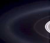 Figure 1 Not since NASA's Voyager 1 spacecraft saw our home as a pale blue dot from beyond the orbit of Neptune has Earth been imaged in color from the outer solar system. Now, Cassini casts powerful eyes on our home planet, and captures Earth, a pale blue orb -- and a faint suggestion of our moon -- among the glories of the Saturn system. Earth is captured here in a natural color portrait made possible by the passing of Saturn directly in front of the sun from Cassini's point of view. At the distance of Saturn's orbit, Earth is too narrowly separated from the sun for the spacecraft to safely point its cameras and other instruments toward its birthplace without protection from the sun's glare. The Earth-and-moon system is visible as a bright blue point on the right side of the image above center. Here, Cassini is looking down on the Atlantic Ocean and the western coast of north Africa. The phase angle of Earth, seen from Cassini is about 30 degrees. A magnified view of the image (see figure 1) taken through the clear filter (monochrome) shows the moon as a dim protrusion to the upper left of Earth. Seen from the outer solar system through Cassini's cameras, the entire expanse of direct human experience, so far, is nothing more than a few pixels across. Earth no longer holds the distinction of being our solar system's only "water world," as several other bodies suggest the possibility that they too harbor liquid water beneath their surfaces. The Saturnian moon, Enceladus, is among them, and is also captured on the left in this image, with its plume of water ice particles and swathed in the blue E ring which it creates. Delicate fingers of material extend from the active moon into the E ring. See PIA08321, for a more detailed view of these newly-revealed features. The narrow tenuous G ring and the main rings are seen at the right. The view looks down from about 15 degrees above the un-illuminated side of the rings. Images taken using red, green and blue spectral filters were combined to create this view. The image was taken by the Cassini spacecraft wide-angle camera on Sept. 15, 2006, at a distance of approximately 2.1 million kilometers (1.3 million miles) from Saturn and at a sun-Saturn-spacecraft angle of almost 179 degrees. Image scale is approximately 250 kilometers (155 miles) per pixel. At this time, Cassini was nearly 1.5 billion kilometers (930 million miles) from Earth. |