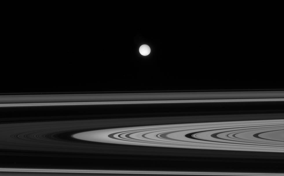 Enceladus is seen here, across the unilluminated side of Saturn's rings. A hint of the moon's active south polar region can be seen as a just slightly dark area at bottom. This view was obtained from about 1 degree above the ringplane. Enceladus is 505 kilometers (314 miles) across. The image was taken in polarized green light with the Cassini spacecraft narrow-angle camera on Oct. 27, 2007. The view was acquired at a distance of approximately 2.1 million kilometers (1.3 million miles) from Enceladus. Image scale is 13 kilometers (8 miles) per pixel. |