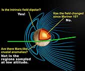 This depiction of a simulated Mercury magnetosphere shows representations of the distortions of the planetary magnetic field lines (blue) by the solar wind. Mariner 10 data showed the first evidence for a magnetic field at Mercury, an unexpected result. The equatorial pass of MESSENGER during quiet solar conditions provided better data than were available from Mariner 10. MESSENGER saw an internal magnetic field that is well described by the field from a dipole nearly aligned with the planet's spin axis (dipole tilt ~ 10°). This geometry is similar to that observed by Mariner 10 during its first flyby. The field strength is weaker by about one third than that detected by Mariner 10 during its third (and last) flyby, owing primarily to the difference in trajectories (Mariner 10 flow directly over the magnetic pole where the field strength is greatest). When corrected for our best estimate for the external field, the MESSENGER observations and the two Mariner 10 passes are consistent with very similar solutions for the mean planetary magnetic dipole. The dipolar field is consistent with an active electrical dynamo in which the magnetic field is produced by electrical currents flowing in an outer core of molten metal. The observations do not yet allow us to identify whether a small secular variation may have occurred, determine higher order structure in the field, or assess whether crustal magnetic signatures may be present at other longitudes. A combination of the next two flybys and the orbital phase of MESSENGER's mission will be required to sort out all of these possible effects. |