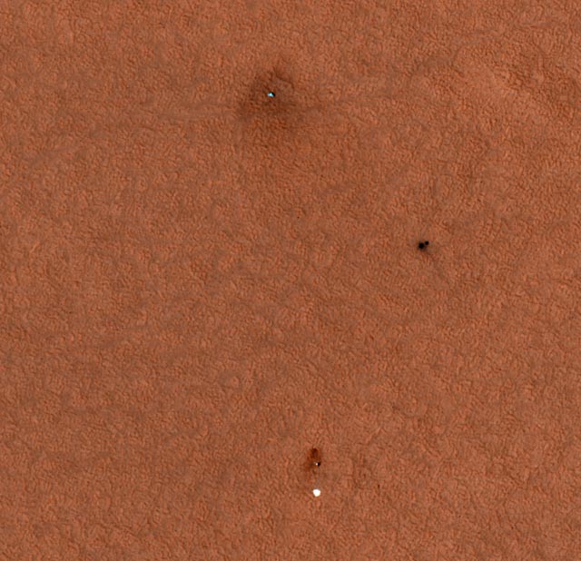 This enhanced-color image from Mars Reconnaissance Orbiter's High Resolution Imaging Science Experiment (HiRISE) camera shows the Phoenix landing area viewed from orbit. The spacecraft appears more blue than it would in reality. From top to bottom are the Phoenix lander with its solar panels deployed on the Martian surface, the heat shield and bounce mark the heat shield made on the Martian surface, and the top of the Phoenix parachute attached to the bottom of the back shell. The Phoenix Mission is led by the University of Arizona, Tucson, on behalf of NASA. Project management of the mission is by NASA's Jet Propulsion Laboratory, Pasadena, Calif. Spacecraft development is by Lockheed Martin Space Systems, Denver. |