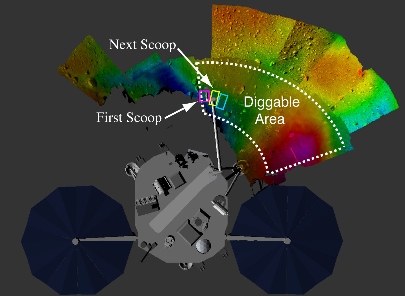 This image shows where NASA's Phoenix Mars Lander's Robotic Arm scoop has started digging, and the next areas planned for digging. The majority of the area to the right of the current trench is being preserved for future digging. The Phoenix Mission is led by the University of Arizona, Tucson, on behalf of NASA. Project management of the mission is by NASA's Jet Propulsion Laboratory, Pasadena, Calif. Spacecraft development is by Lockheed Martin Space Systems, Denver. |