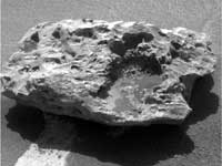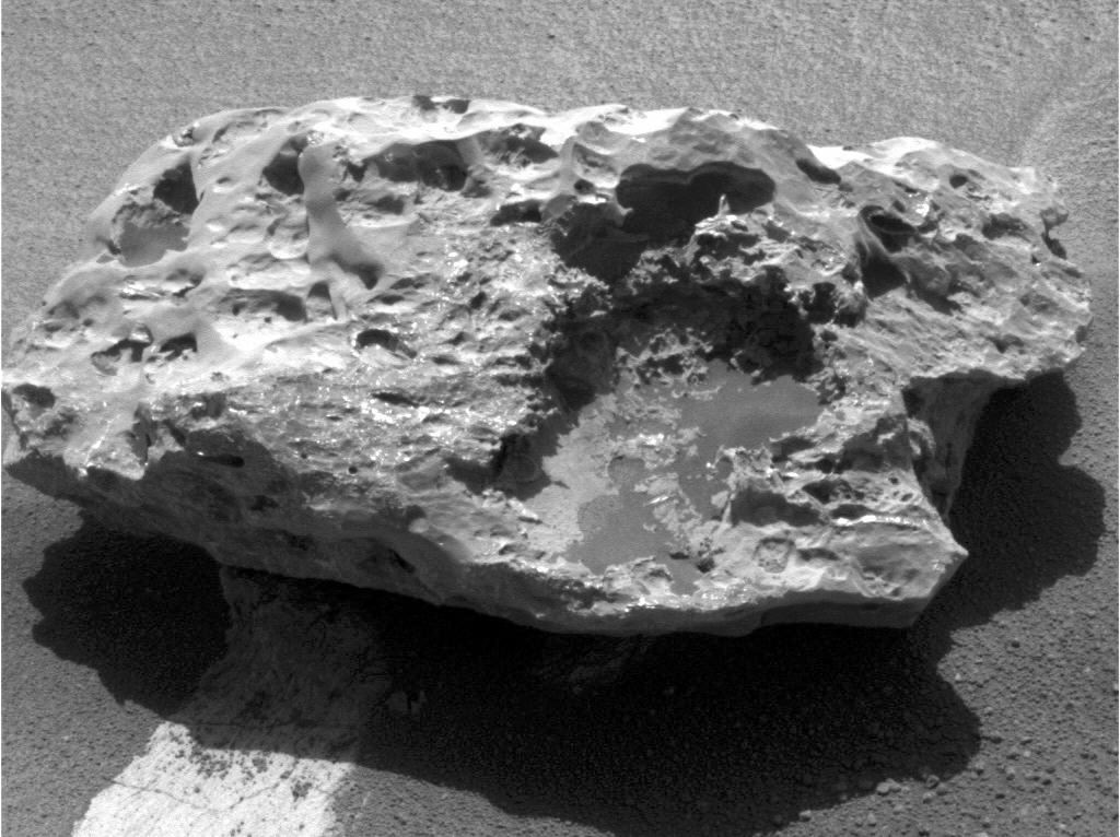 Composition measurements by NASA's Mars Exploration Rover Opportunity confirm that this rock on the Martian surface is an iron-nickel meteorite. This is the right eye image of the rover's panoramic camera used to provide a three-dimensional view when seen through red-green glasses with the red lens on the left (See PIA12165). The camera took the component images during the 1,961st Martian day, or sol, of Opportunity's mission on Mars (July 31), after approaching close enough to touch the rock with tools on the rover's robotic arm. Researchers have informally named the rock "Block Island." With a width of about two-thirds of a meter (2 feet), it is the largest meteorite yet found on Mars. Opportunity found a smaller iron-nickel meteorite, called "Heat Shield Rock" in late 2004. |