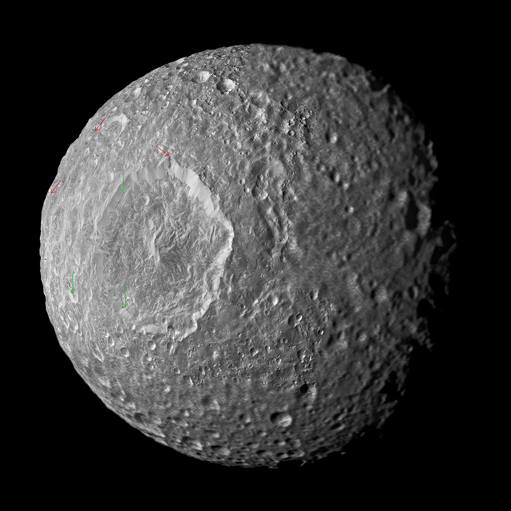 The relatively dark markings appear along the lower portion of the walls of Herschel Crater (130 kilometers, 80 miles wide) and some of the smaller craters and are marked in green in the annotated version of the image. Cassini scientists interpret this darkening as evidence for the gradual concentration of impurities from evaporating icy materials in areas where the dark impurities slide slowly down the crater wall. There, the bright ice is baked away by the sun and the vacuum of space. At Herschel, the edge where the darker regions contact the crater floor is interrupted by an extensive hummocky area. Scientists believe the hummocky texture came from the flow of melted ice that occurred during the impact that created the crater. That melt filled the bottom of the crater around the central peak.